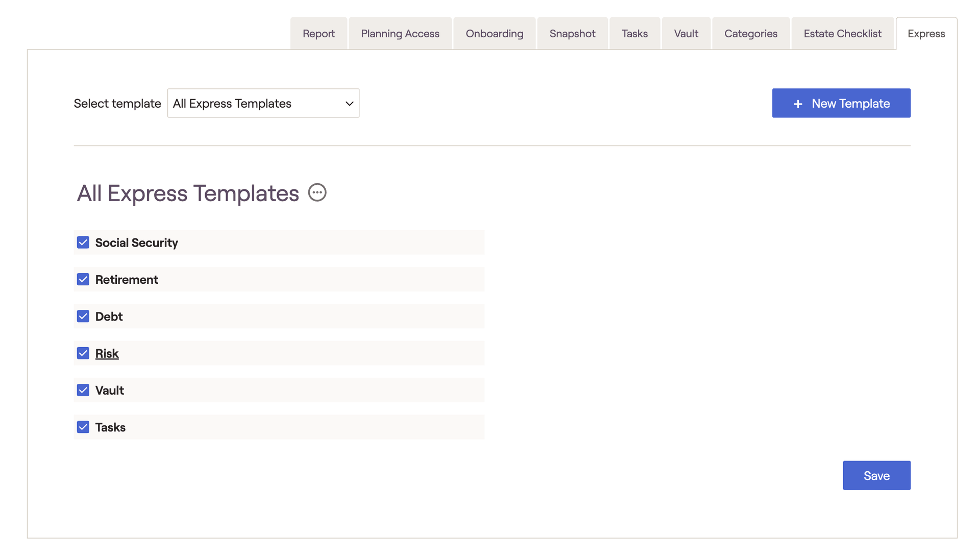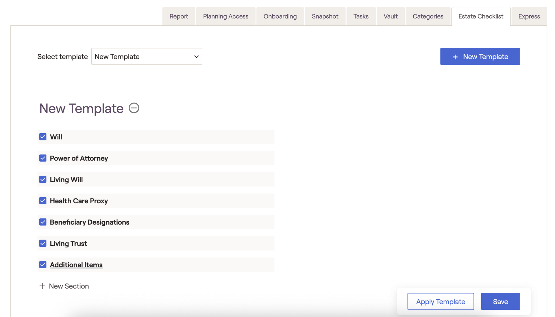 Estate Checklist Templates allow you to save a specific setup for the Estate Checklist section within each Client plan. That way, if you have checklist items you commonly add to a client's plan, you can preset a version of the checklist that will automatically include them.