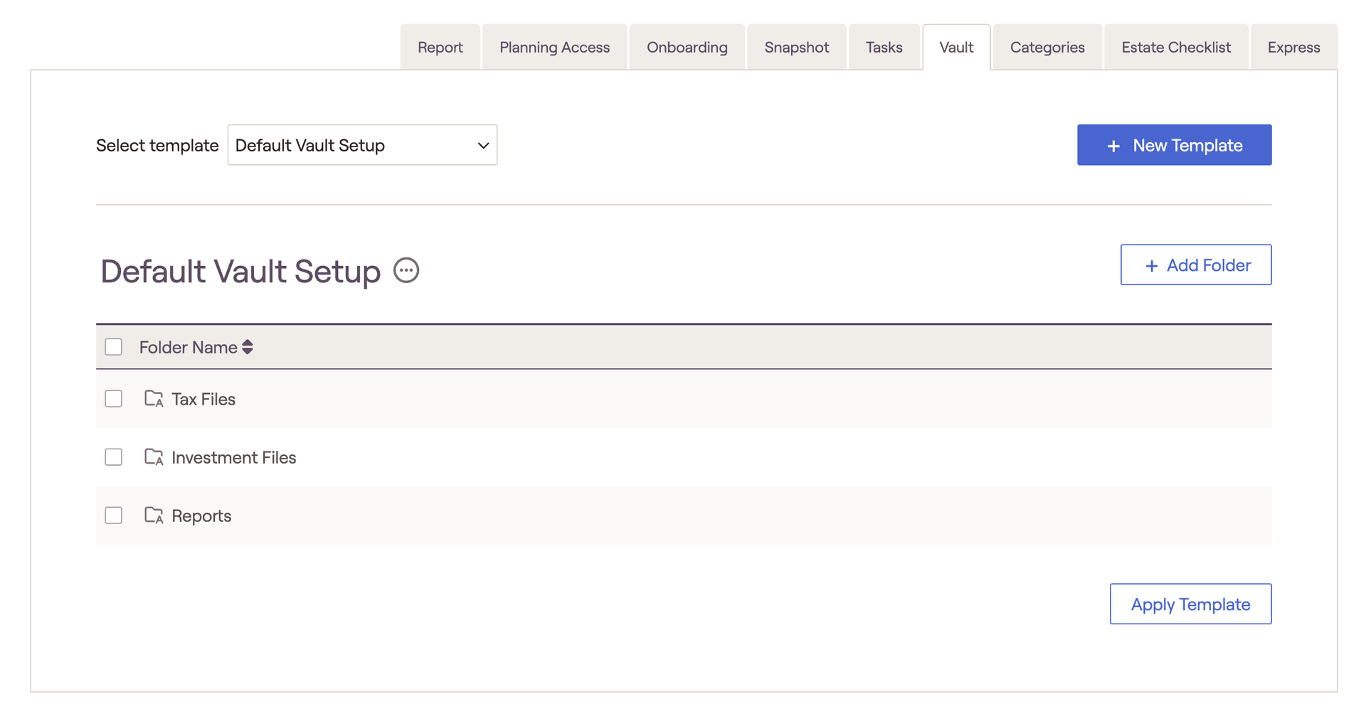 RightCapital's Vault storage provides you and your clients with an easily accessible, highly secure location to share documents and other files. Vault templates let you create vault folder layouts in advance, to help organize your files in a way that best suits your needs.