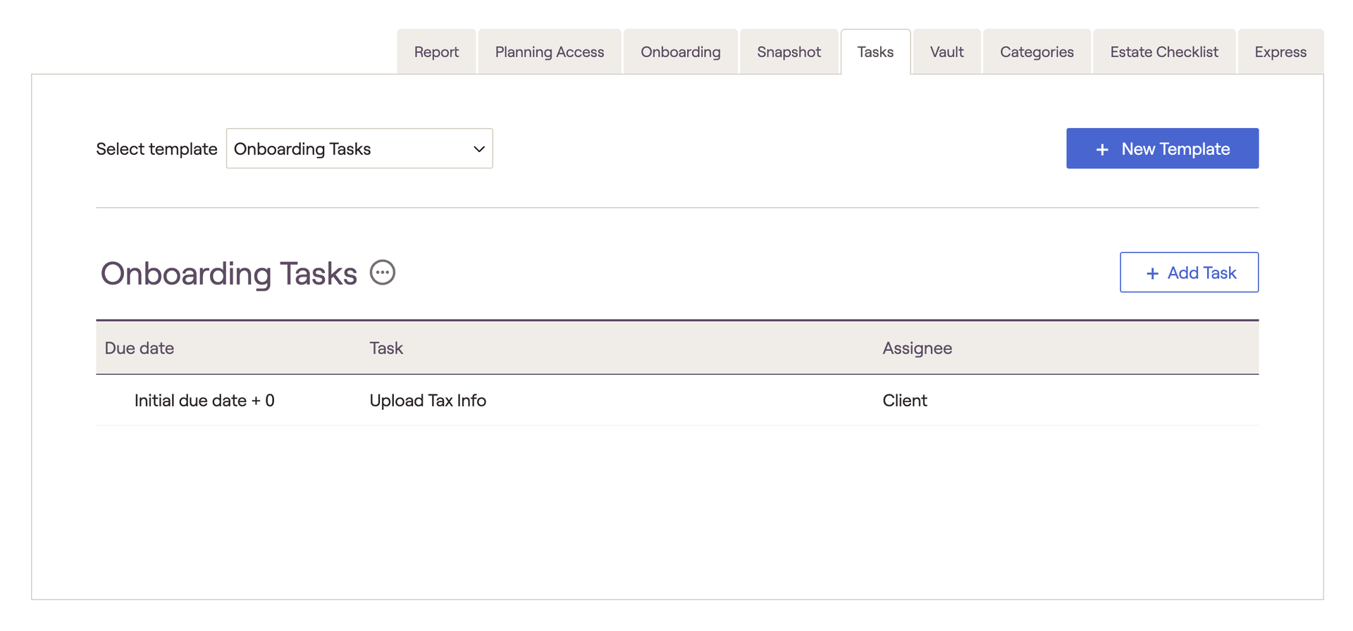 Task templates allow you to curate a sequential set of multiple tasks and assign them all at once within a client plan. Tasks can be a great way to keep clients engaged in the planning process and ensure they accomplish agreed upon to-do's.