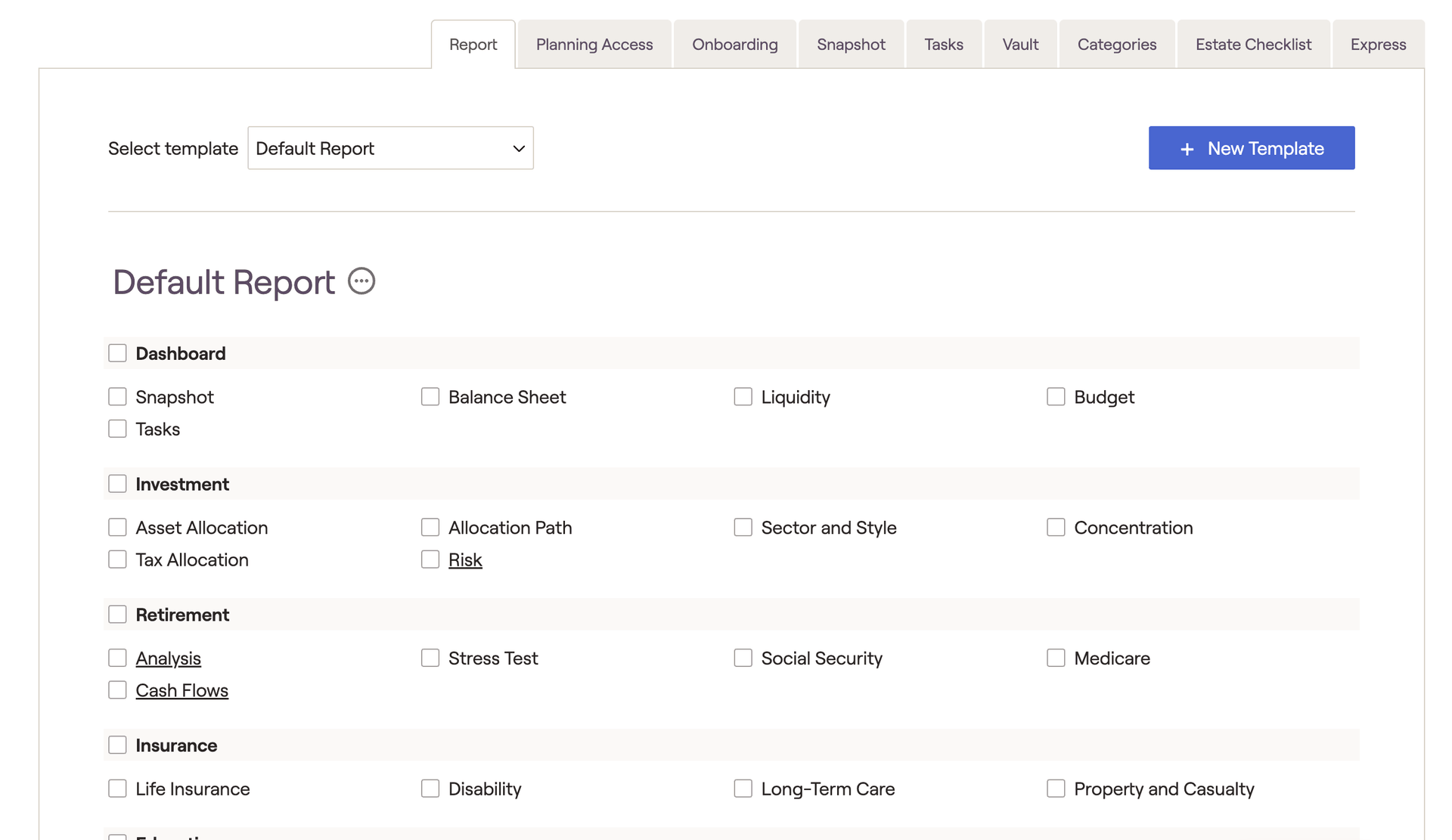Report templates allow you to save a particular report layout for quick and easy use going forward. Utilizing report templates is a great way to create efficiency and consistency in your financial planning output.