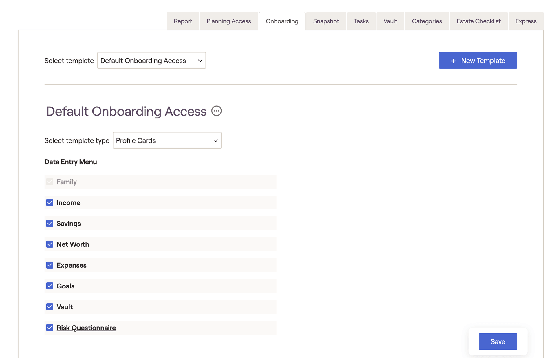 Onboarding templates allow you to include, exclude, and rearrange the steps of the initial data entry process for new clients. These templates can be applied to existing clients, or set as the new default for all future clients.