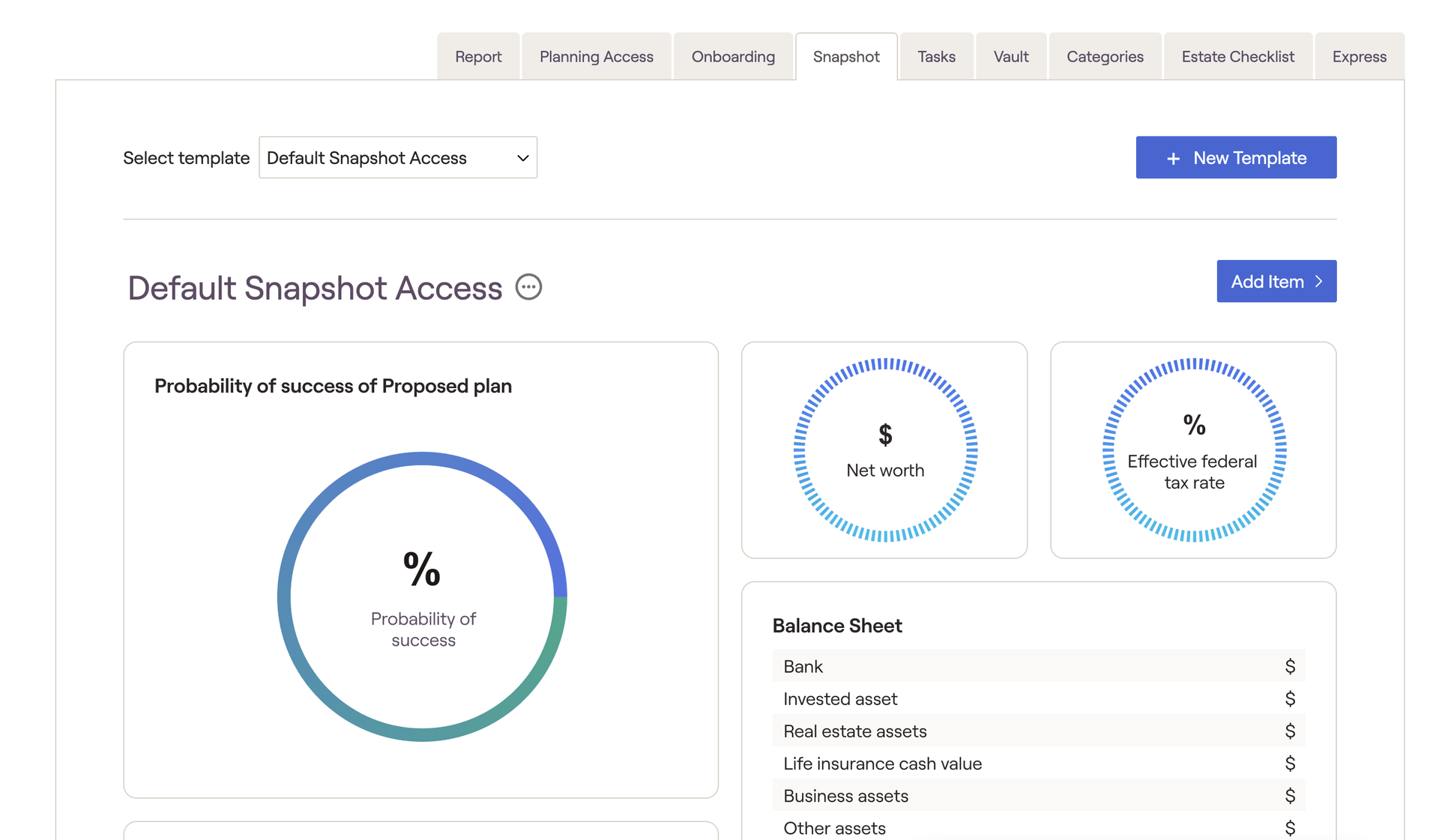 Snapshot templates allow you to create curated layouts for the Snapshot module, and save them for future use. The Snapshot serves as a 1-2 page report in RightCapital, highlighting the key information within a financial plan all in one place.