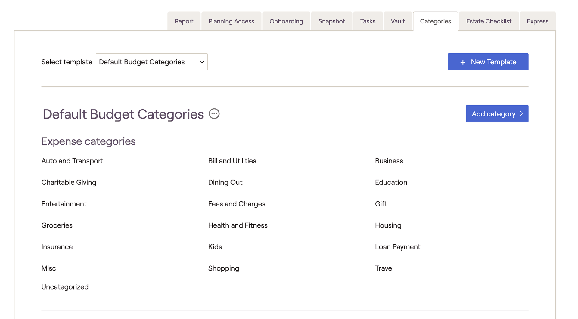 Budget category templates allow you to add, remove, and rename the income and expense categories that are used within the Budget module and Living Expense cards. You can apply these templates to existing clients or set new default categories for future clients.