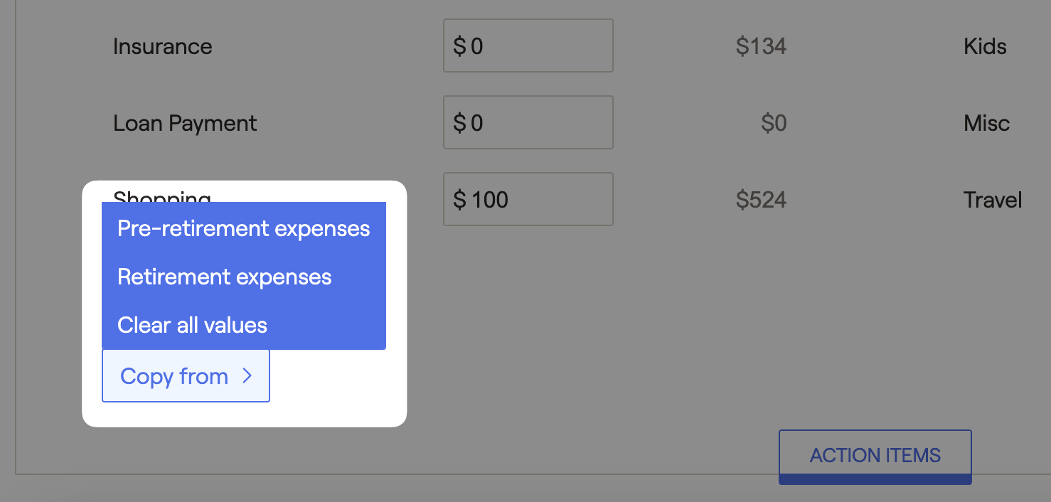 You can also use the client's average monthly spending as a frame of reference when setting the target amount for each category. Use the dropdown menu in the upper right to select a time frame, which will update the values in the Avg. monthly spend column: