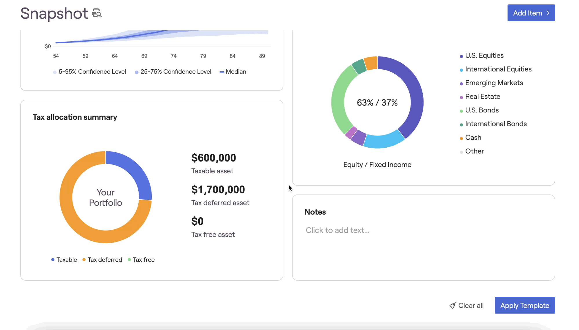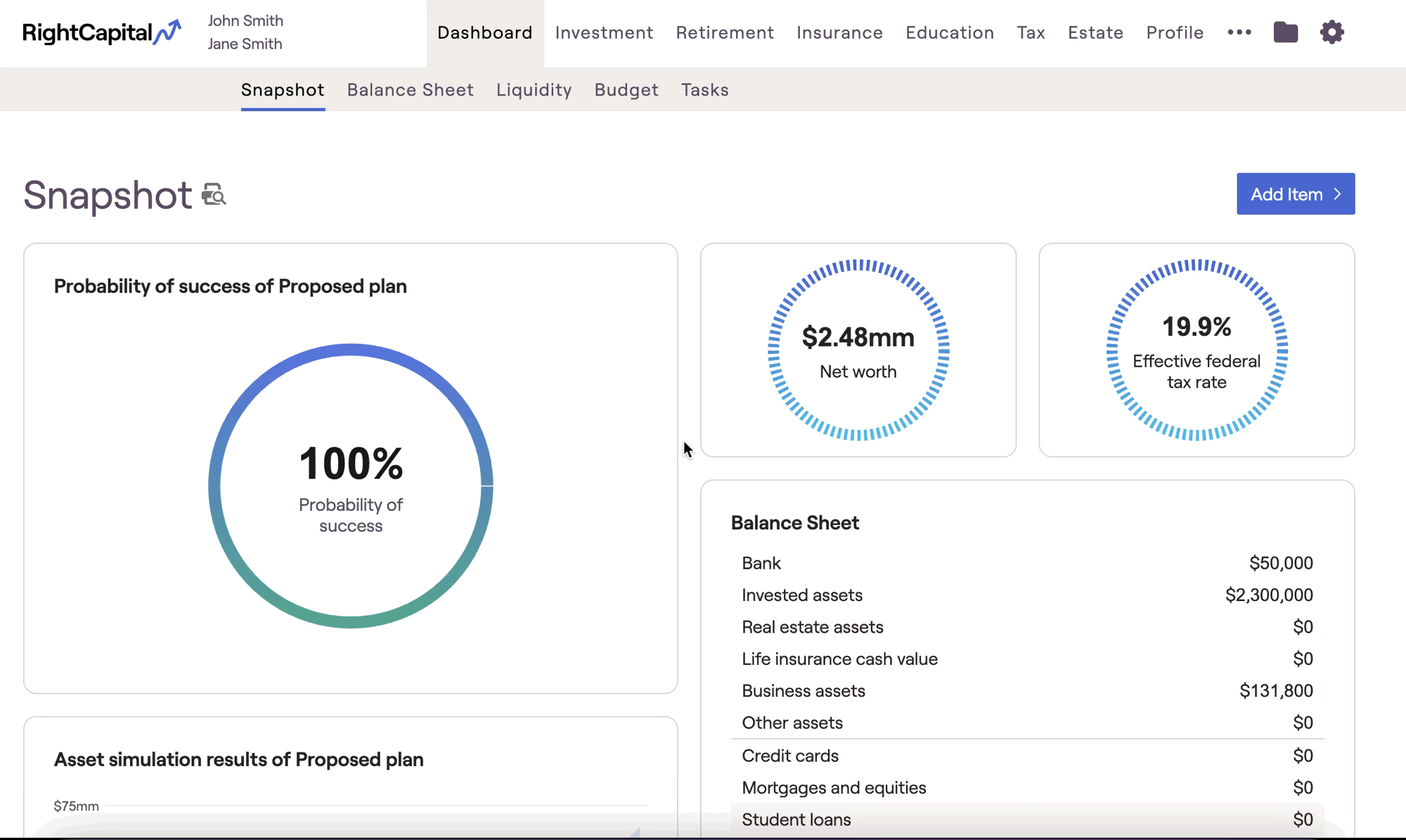 Try using the Snapshot module as the "home page" in your client meetings. After adding the necessary items and customizing the layout, you can use the "Open Item" button within each tile to navigate around RightCapital as you discuss each element of the financial plan with your client.