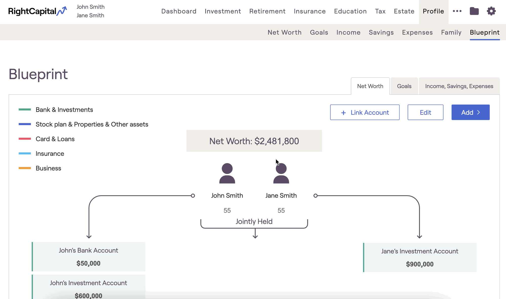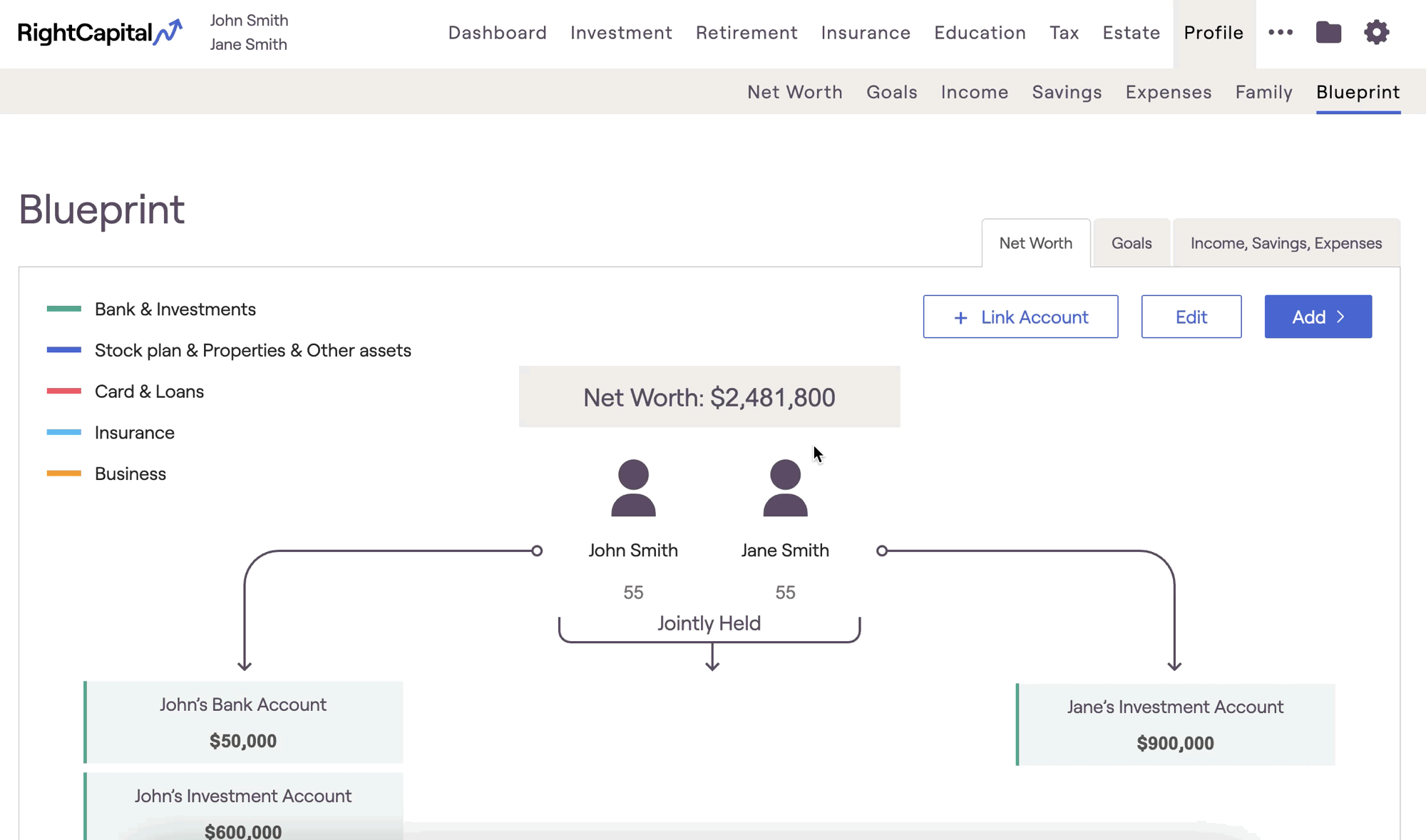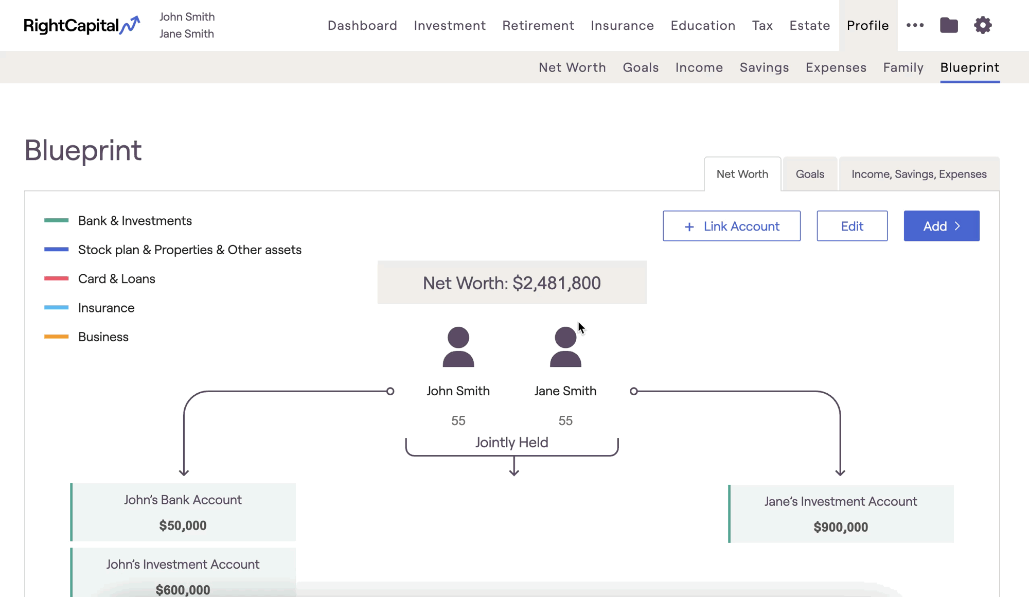 The first Blueprint tab is the Net Worth. Here you can view the overall net worth, household members, and all assets and liabilities within a client plan. Assets & liabilities are color-coded by asset type, and are grouped together by owner: