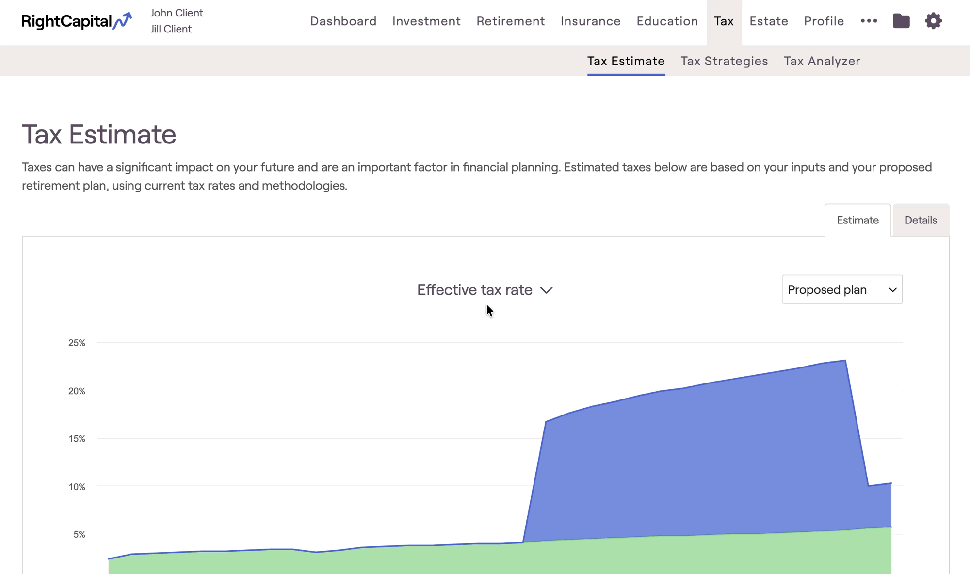 The Estimate tab provides three graphs that illustrate the client's tax rates over their life expectancy. Using the toggle above the chart, you can choose between graphs that illustrate the effective tax rate, ordinary income tax rate, or capital gains tax rate. You can switch between viewing your current and proposed plans using the dropdown menu to the upper right of the graph.