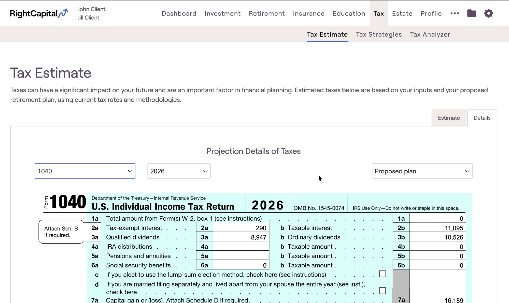 The Tax > Tax Estimate module in RightCapital provides an overview of tax rates and sample tax forms for each proposal by year through the end of the planning horizon. This module allows you to illustrate to clients their effective tax rate, ordinary income tax rate, and capital gains tax rate throughout their financial plan. You can also review sample tax forms, including the Simplified 1040, Schedules 1-3, Schedules A, B, and D, Form 6251 (AMT), and Taxable Social Security worksheet.