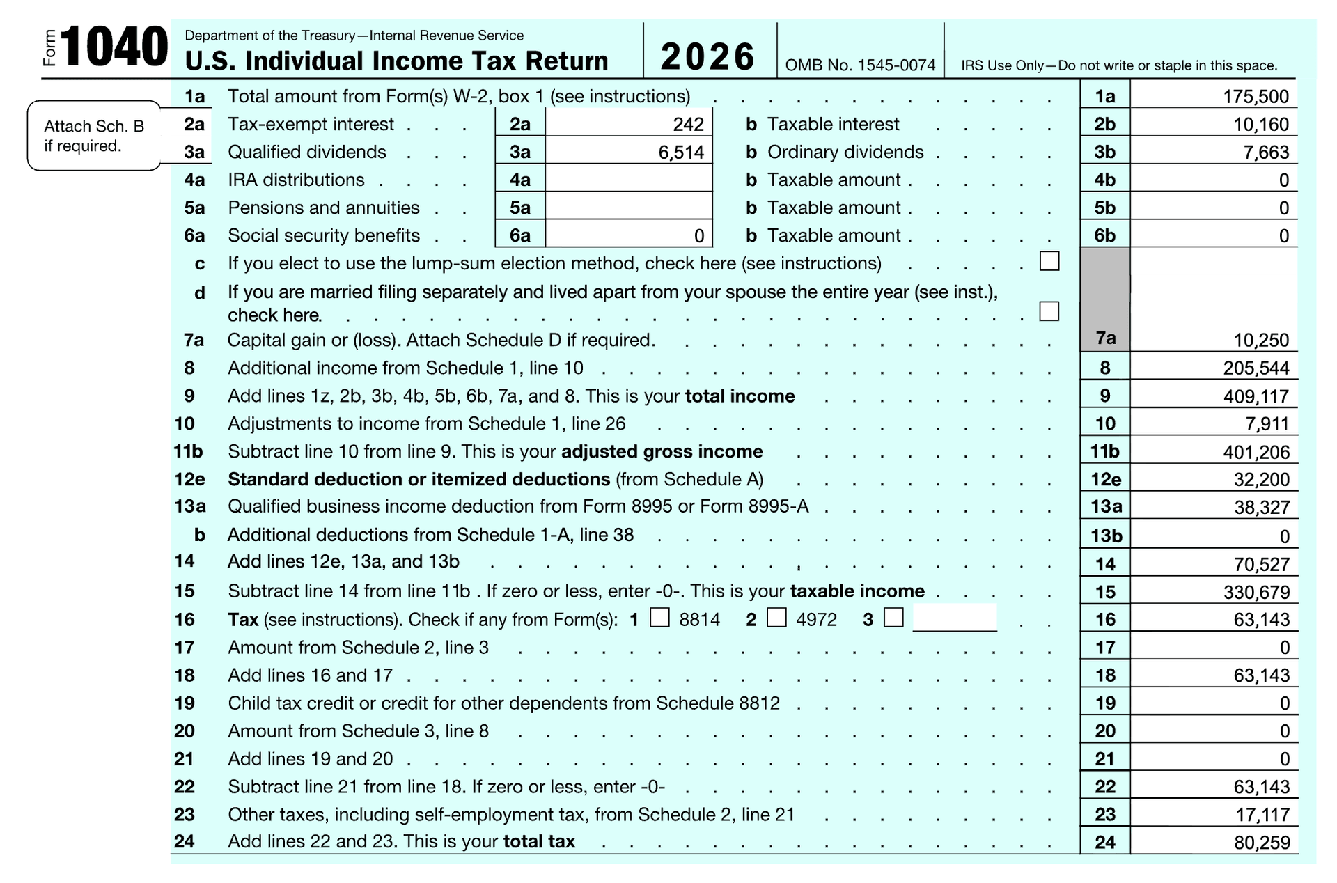 Line 8 Additional income: Reflects other income (such as self-employment income, rental income, and business income) feeding in from the Schedule 1.