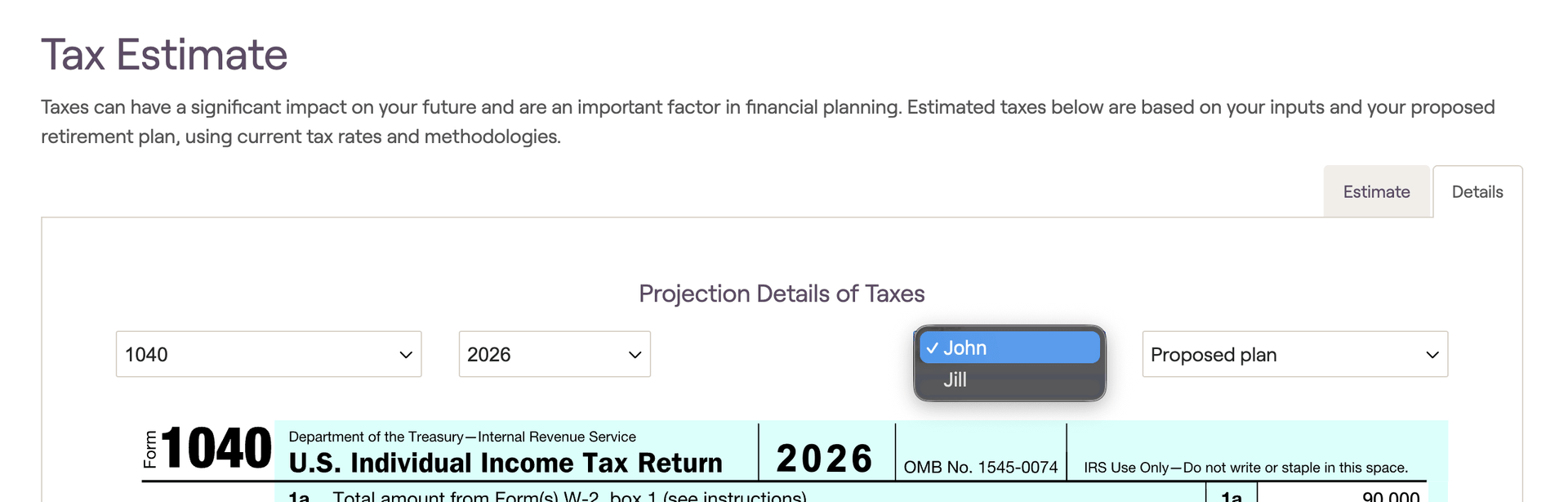 The Tax Estimate section is broken down into two subtabs: the Estimate tab and the Details tab. See below for an overview of each.