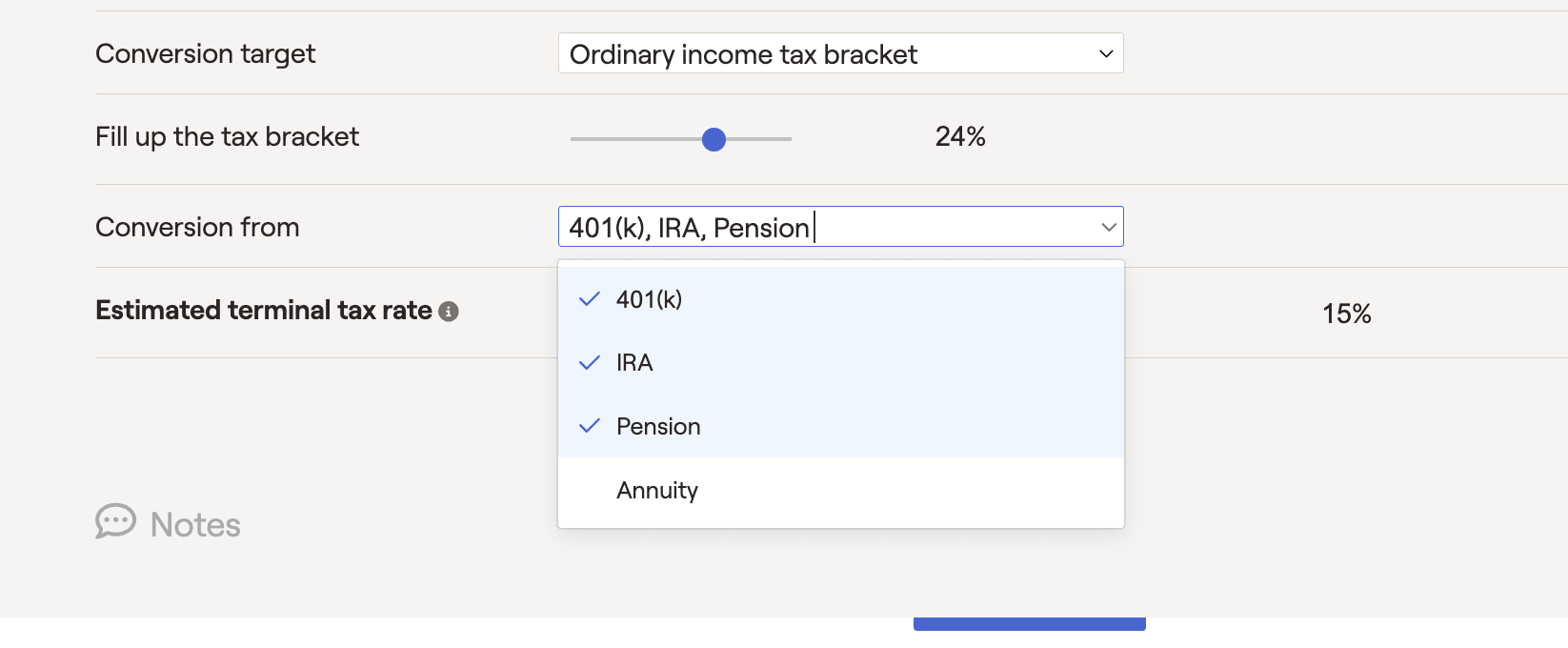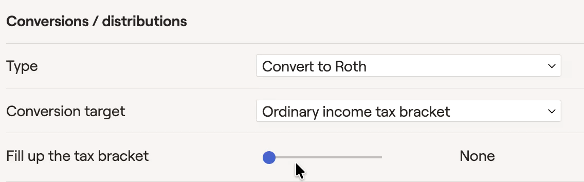 After selecting a target, use the 'Fill up the tax bracket' slider to choose a specific bracket threshold. RightCapital will then convert/distribute as much as possible without exceeding the specified bracket. Please note that these are the upper thresholds of each bracket (hence no 37% bracket for ordinary income, or 20% for capital gains):