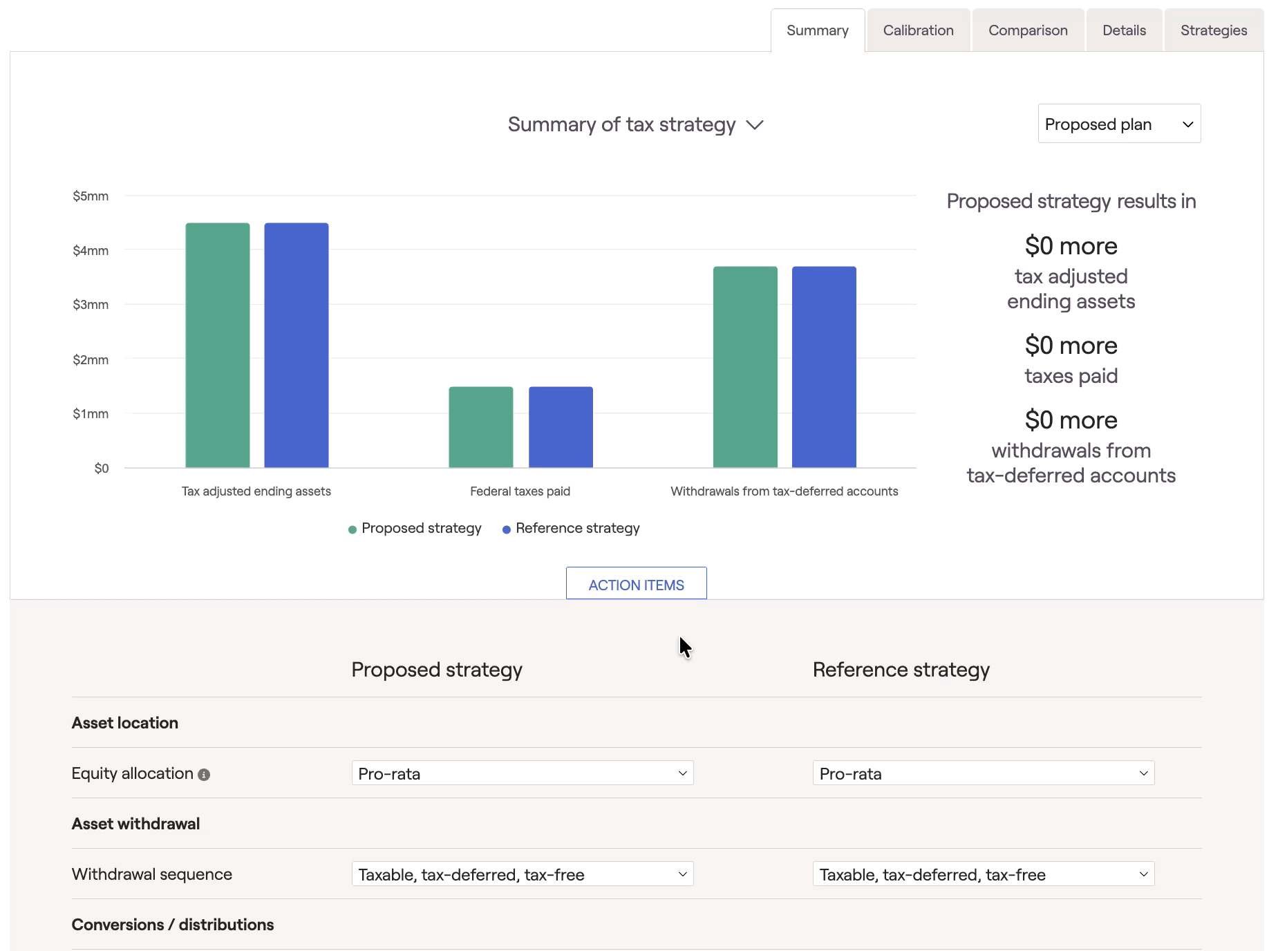 - Use the Action Items to model Roth conversions, shift a client's Asset location, and alter their Withdrawal sequence.