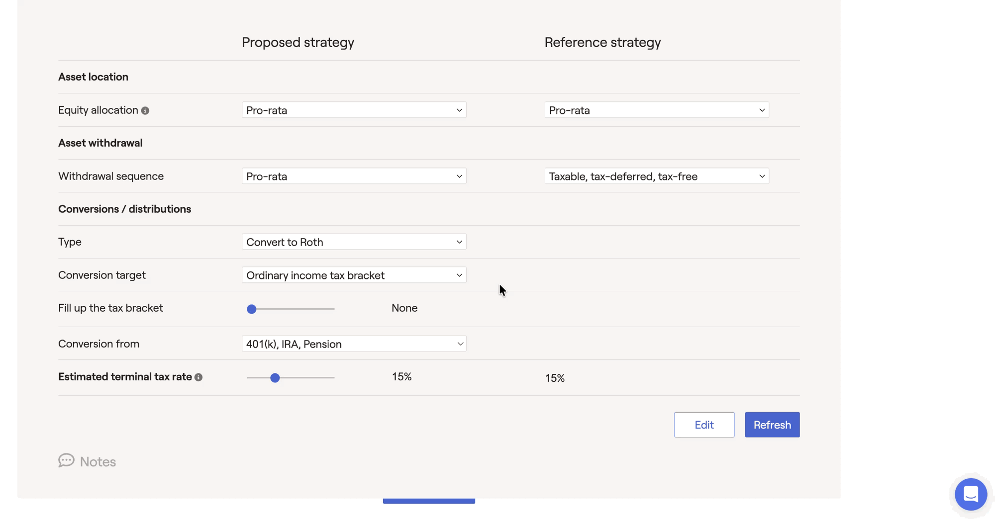 Please note that the estimated terminal tax rate will only impact the values displayed within the Tax Strategies tab. This slider will not have an impact on other areas of the software, including the Retirement Analysis when importing a tax strategy proposal (put differently, the Retirement Analysis reflects a 0% terminal tax rate).